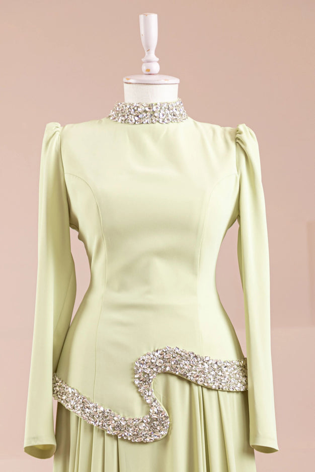 تقدم Selva Tesettür Abiye فستان سهرة أنيق ورقيق للمحجبات بتصميم حديث بقصة A. هذا الفستان المصنوع من قماش كريب ساتان ذو السقوط السلس، مع تفاصيل مزينة بالأحجار، يعد ببريق رقيق في المناسبات الخاصة.