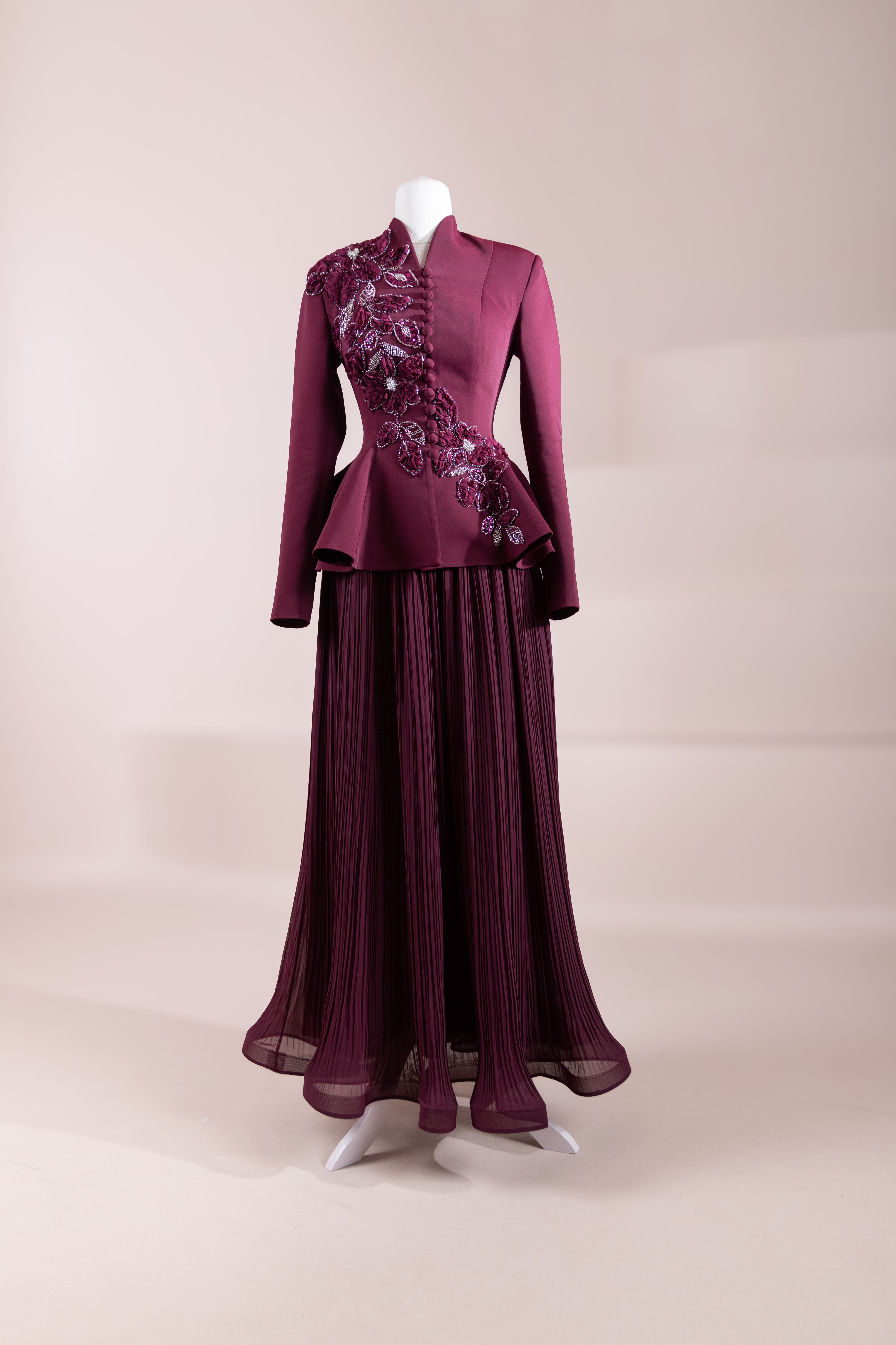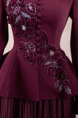ails):|أخطاء):• في الجزء العلوي، توجد تطبيقات زهور بارزة وتطريزات دانتيل في الأمام.• التطريزات موضوعة بشكل غير متماثل تعبر الجسم بشكل مائل.• إغلاق الجاكيت الأمامي يتميز بسحّاب مخفي أو أزرار مخفية مما يعطي سطحًا نظيفًا (لا يظهر بالكامل لكن الخط واضح وبسيط).• طول الكم كامل، والأساور بها اتساع بسيط.• تضيف الطيات الكثيفة في الجزء السفلي من التنورة حركة وأناقة للفساتين.