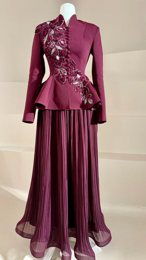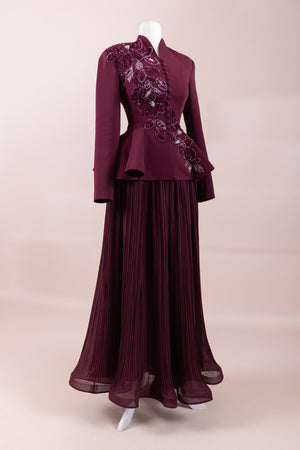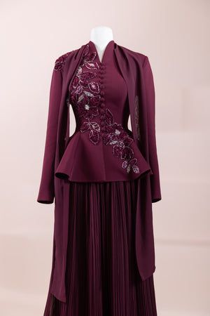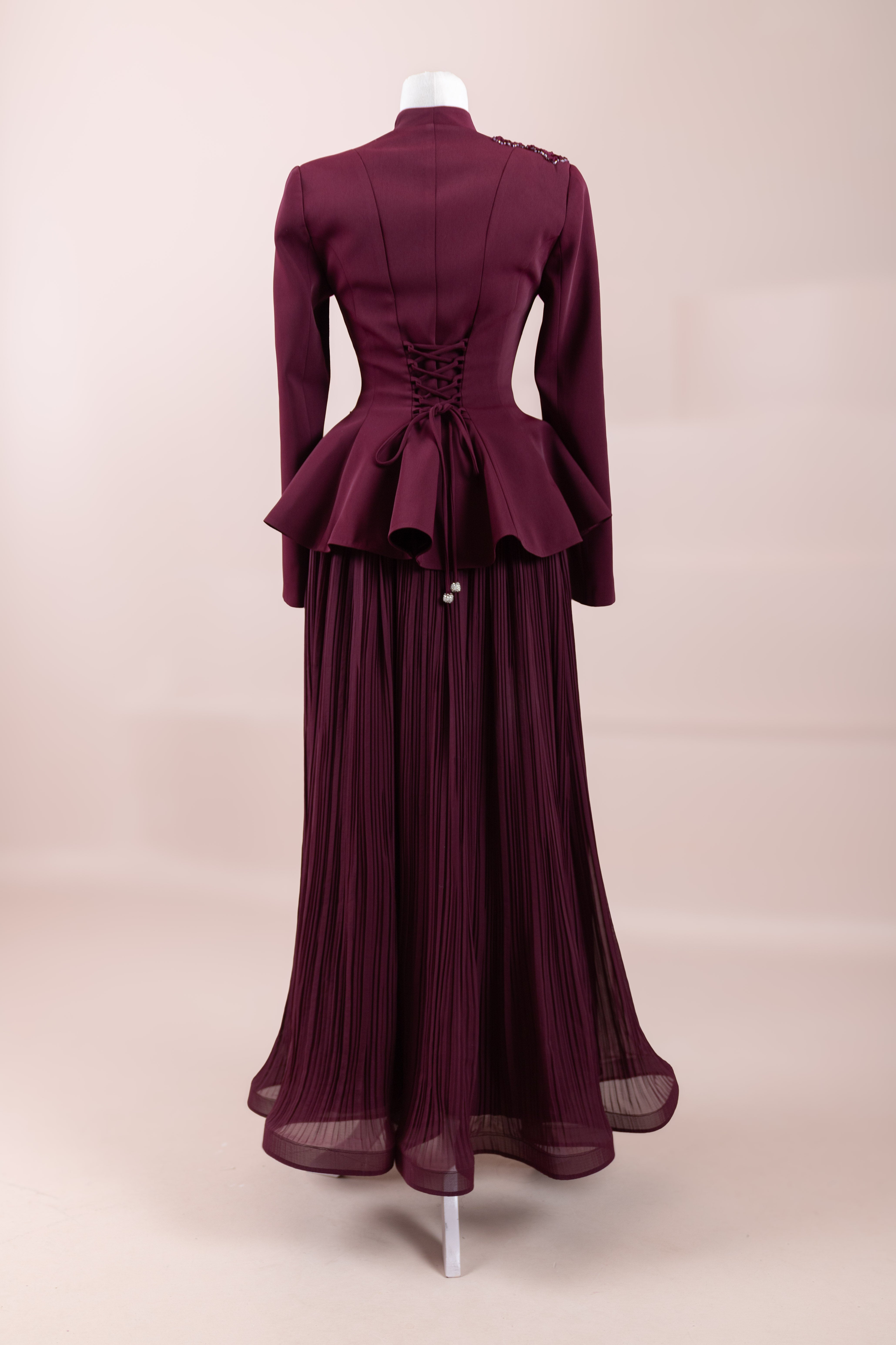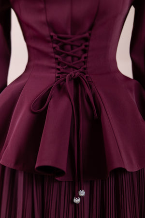 الجزء العلوي يشبه جاكيت بيبلوم، يلتف حول الخصر وله قصّة تتسع قليلاً في الأسفل.• خط الكتف والجسم يبدو هيكليًا / كقالب، مما يعطي مظهرًا أكثر رسمية.• الجزء السفلي من التنورة طويل، مطوي (مكسر) وله شكل انسيابي نحو الأسفل.• فستان يبدو كأنه من قطعتين لكنه مصمم كقطعة واحدة متكاملة.
