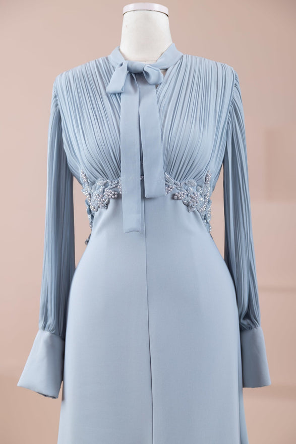 قماش شيفون-كريب متدفق.• توجد تفاصيل مطوية في منطقة الصدر.• توجد زخارف خفيفة من الدانتيل أو التطريز على جانب الخصر؛ مما يضيف مظهراً أكثر أناقة للفستان.