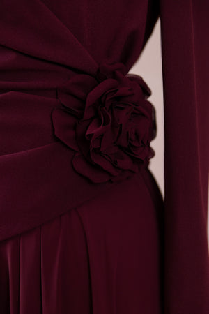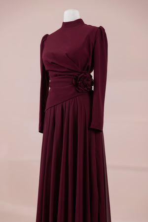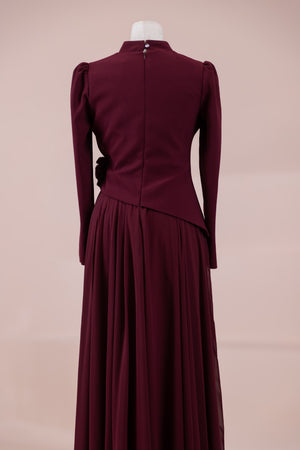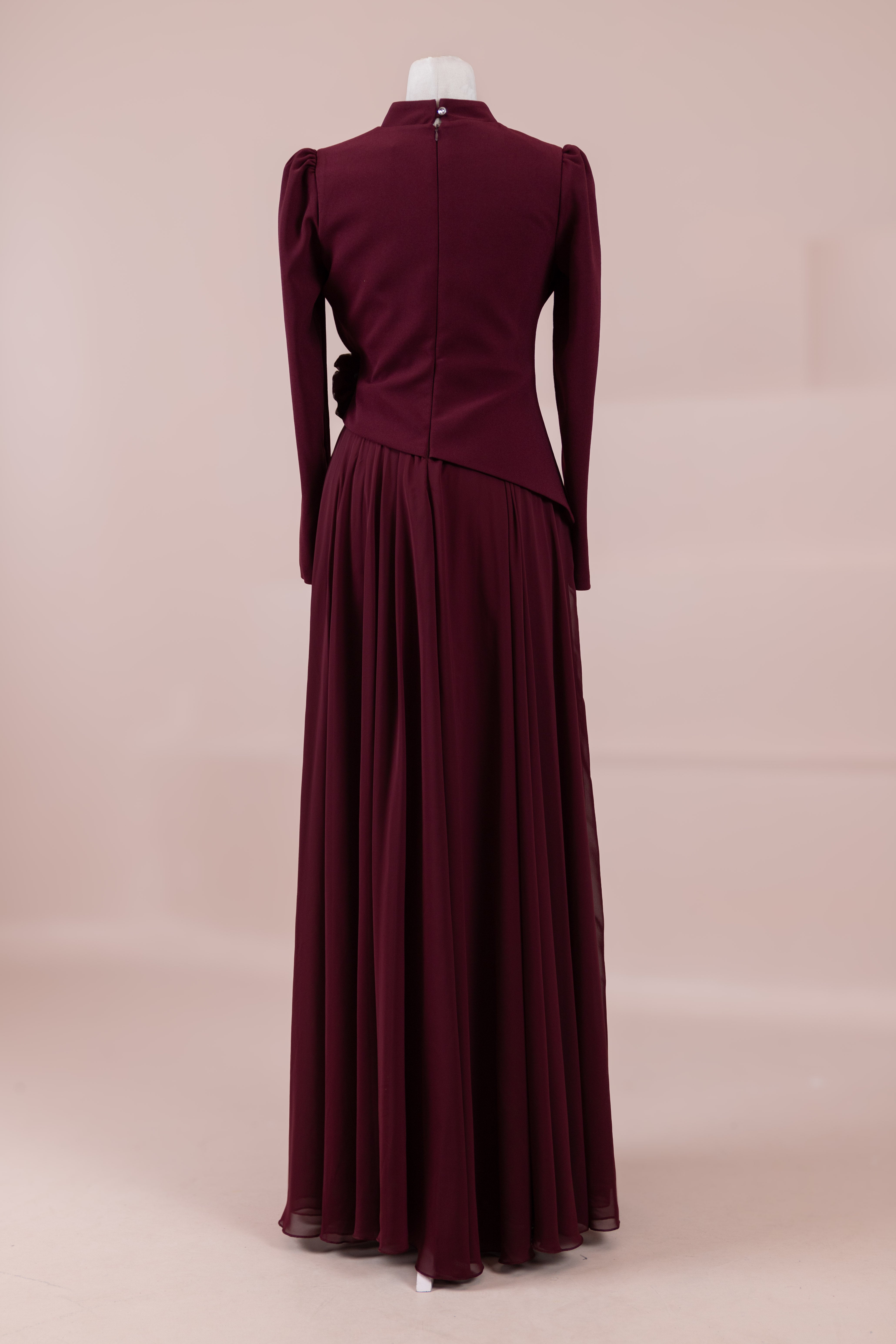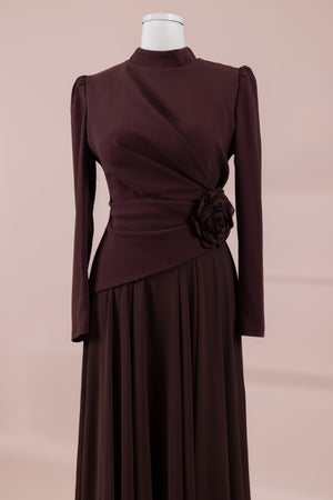 يقدم هذا التصميم الذي يتميز بخطوط أنثوية وأنيقة مظهراً راقياً مع ياقة عالية وأكمام طويلة. تفاصيل الدرابيه المتقاطعة عند الخصر توفر توازناً للجسم وتبرز خصرًا نحيفًا. القطع المتدفق والمنساب في التنورة يضفي حركة وانسيابية ناعمة. الشكل البسيط يكتسب لمسة رومانسية من خلال تفصيل الأزهار الموضوعة عند الخصر.