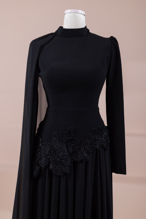 يقدم خط علوي مناسب للجسم لمظهر أنيق. تنفتح التنورة على شكل حرف A من الخصر إلى الأسفل، مما يمنح مظهراً انسيابياً ومتدفقاً. تم تصميم ياقة عالية لإضفاء مظهر عصري وأنيق. تضيف شكل العباءة التي تمتد قطعة واحدة من الكتف إلى الأسفل تفصيلاً فريداً وراقيًا للتصميم. تبرز التطريز غير المتماثل الموضوعة حول الخصر الخط الأنثوي للفستان.