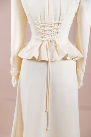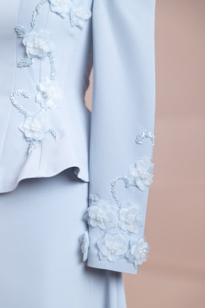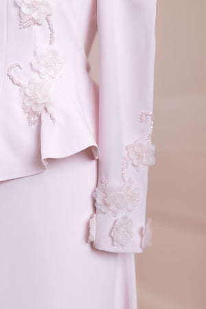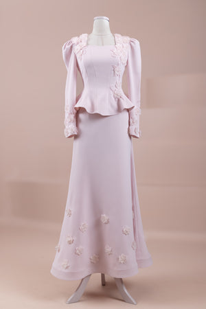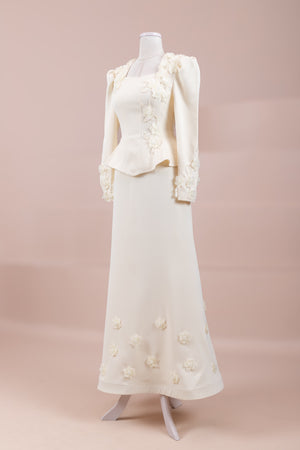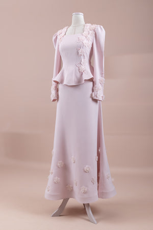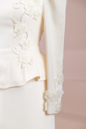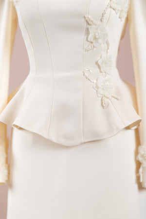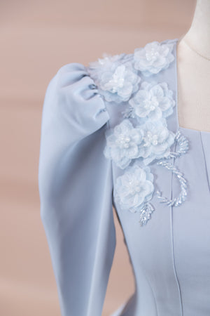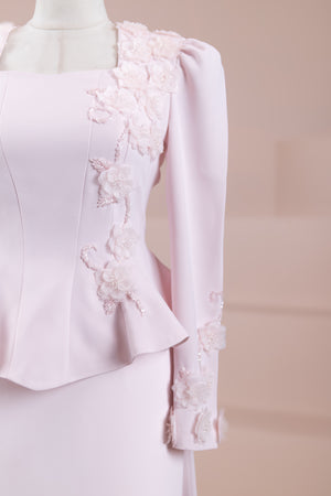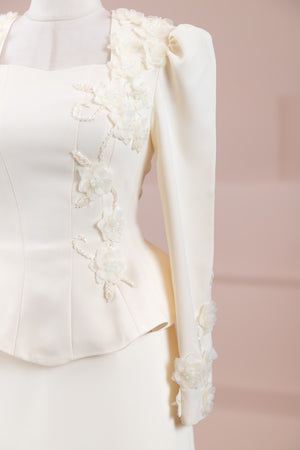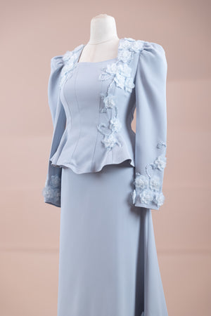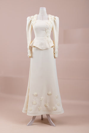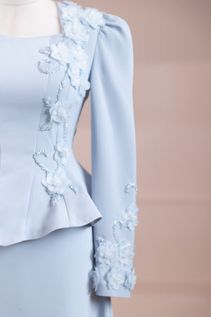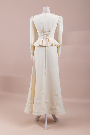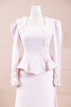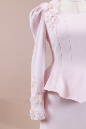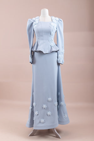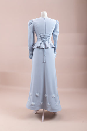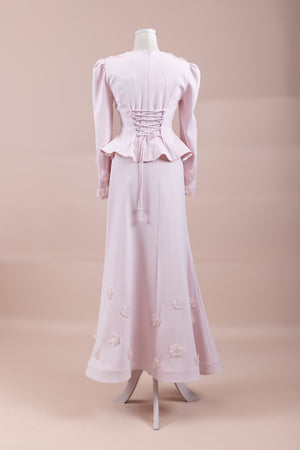 الجزء العلوي من الجسم بقصة ضيقة تناسب الجسم. شكل البيبلوم الموجود عند خط الخصر يضيف حجمًا أنيقًا للخصر ليخلق صورة ظلية أنثوية. الجزء السفلي من التنورة مصمم بقصة A تتسع قليلاً من الخصر إلى الأسفل ويبلغ طوله ماكسي. الأكتاف تحتوي على شكل بالون خفيف.