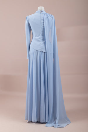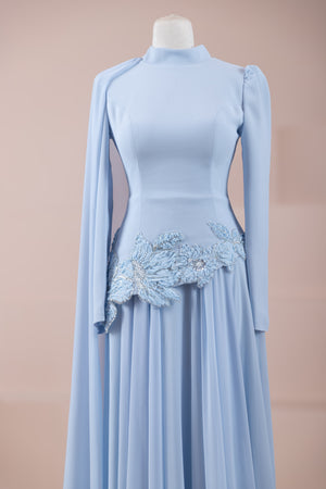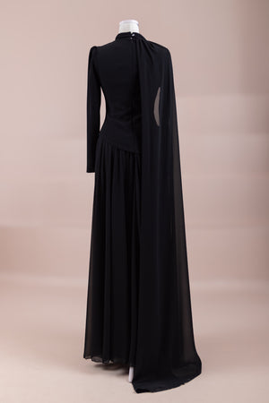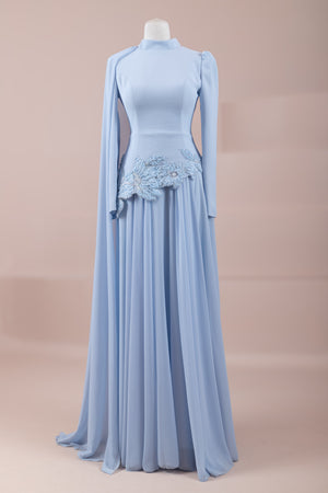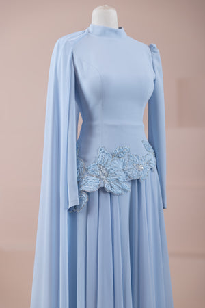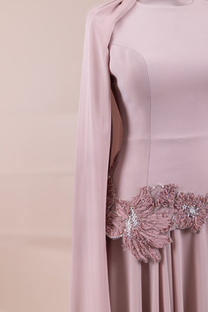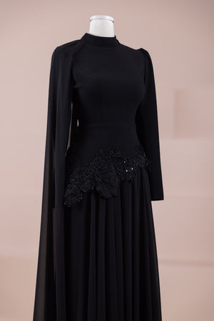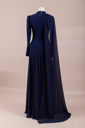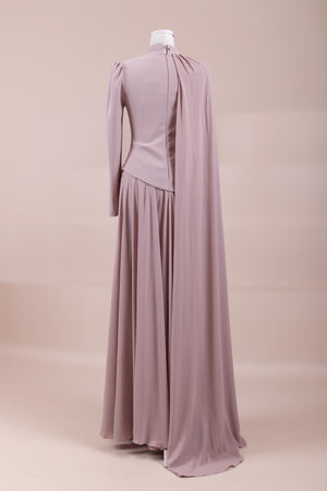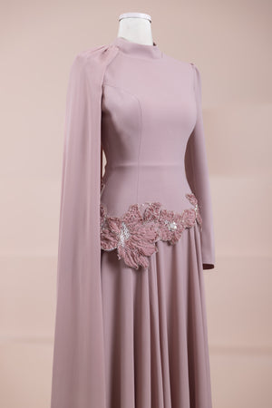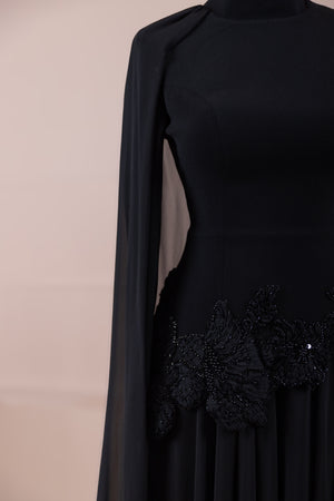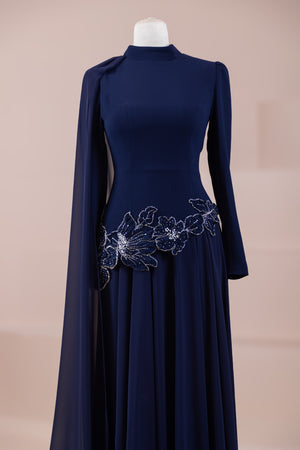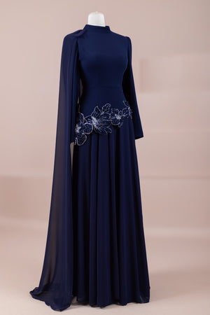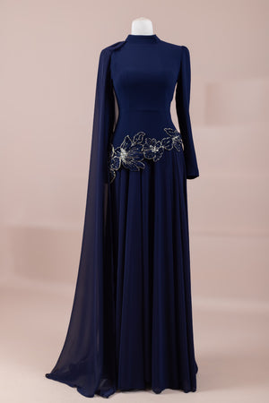 يقدم خط علوي مناسب للجسم لمظهر أنيق. تنفتح التنورة على شكل حرف A من الخصر إلى الأسفل، مما يمنح مظهراً انسيابياً ومتدفقاً. تم تصميم ياقة عالية لإضفاء مظهر عصري وأنيق. تضيف شكل العباءة التي تمتد قطعة واحدة من الكتف إلى الأسفل تفصيلاً فريداً وراقيًا للتصميم. تبرز التطريز غير المتماثل الموضوعة حول الخصر الخط الأنثوي للفستان.