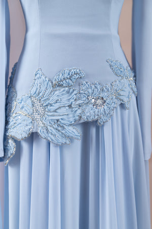 تم تزيين التطريز اليدوي عند الخصر بتفاصيل أنيقة من الخرز والتطريز.