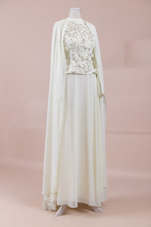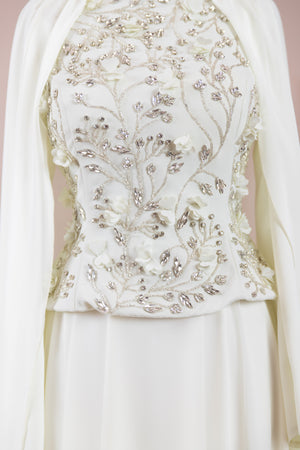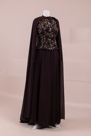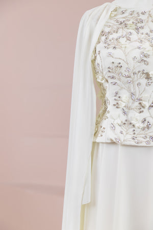 النموذج يتكون من تصميم من قطعتين: فستان داخلي وعباءة شيفون مدمجة فوقه.