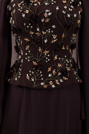 • الجزء الأمامي مزين بالكامل بأعمال يدوية كثيفة من الأحجار والخرز بنقوش زهرية/عضوية