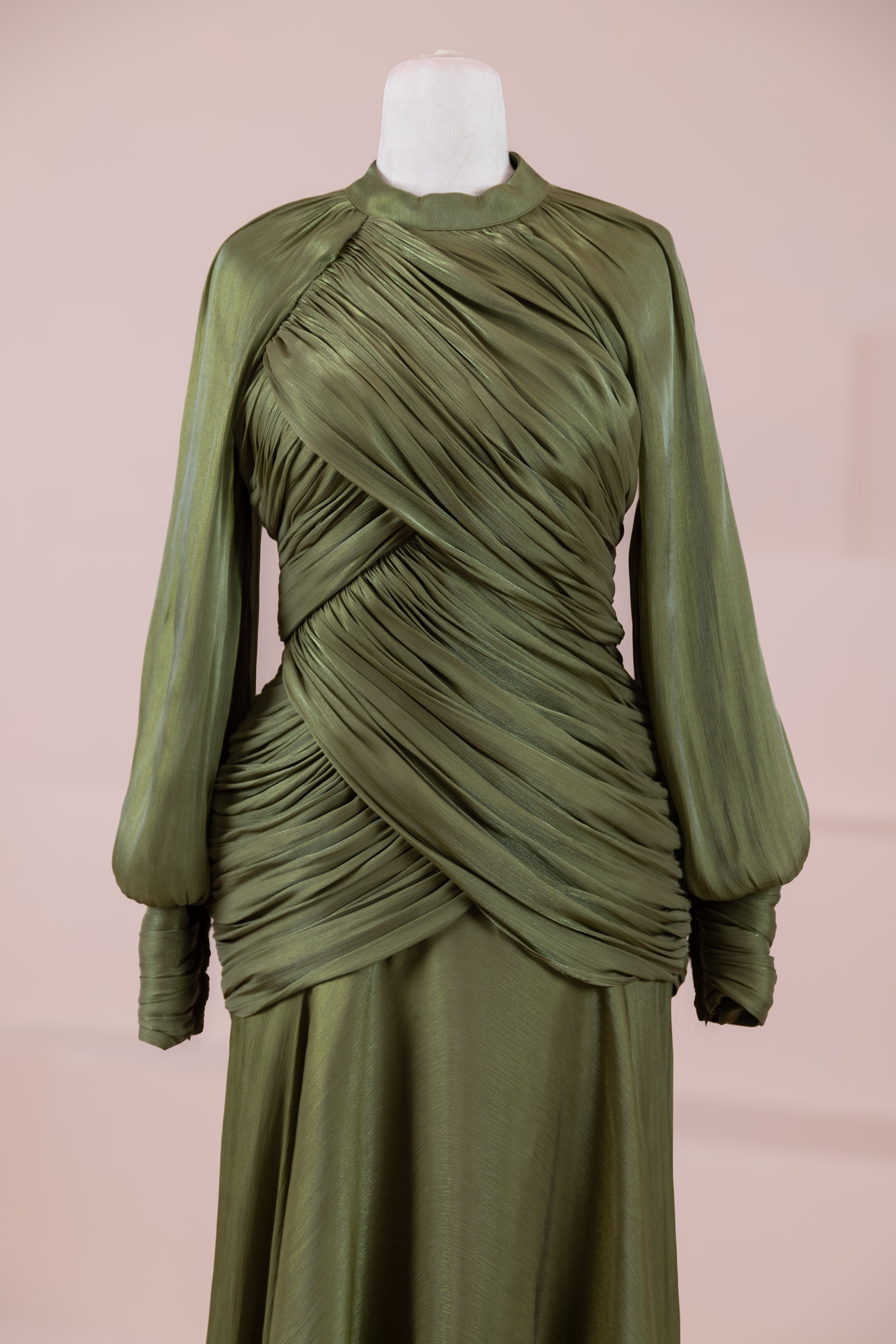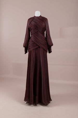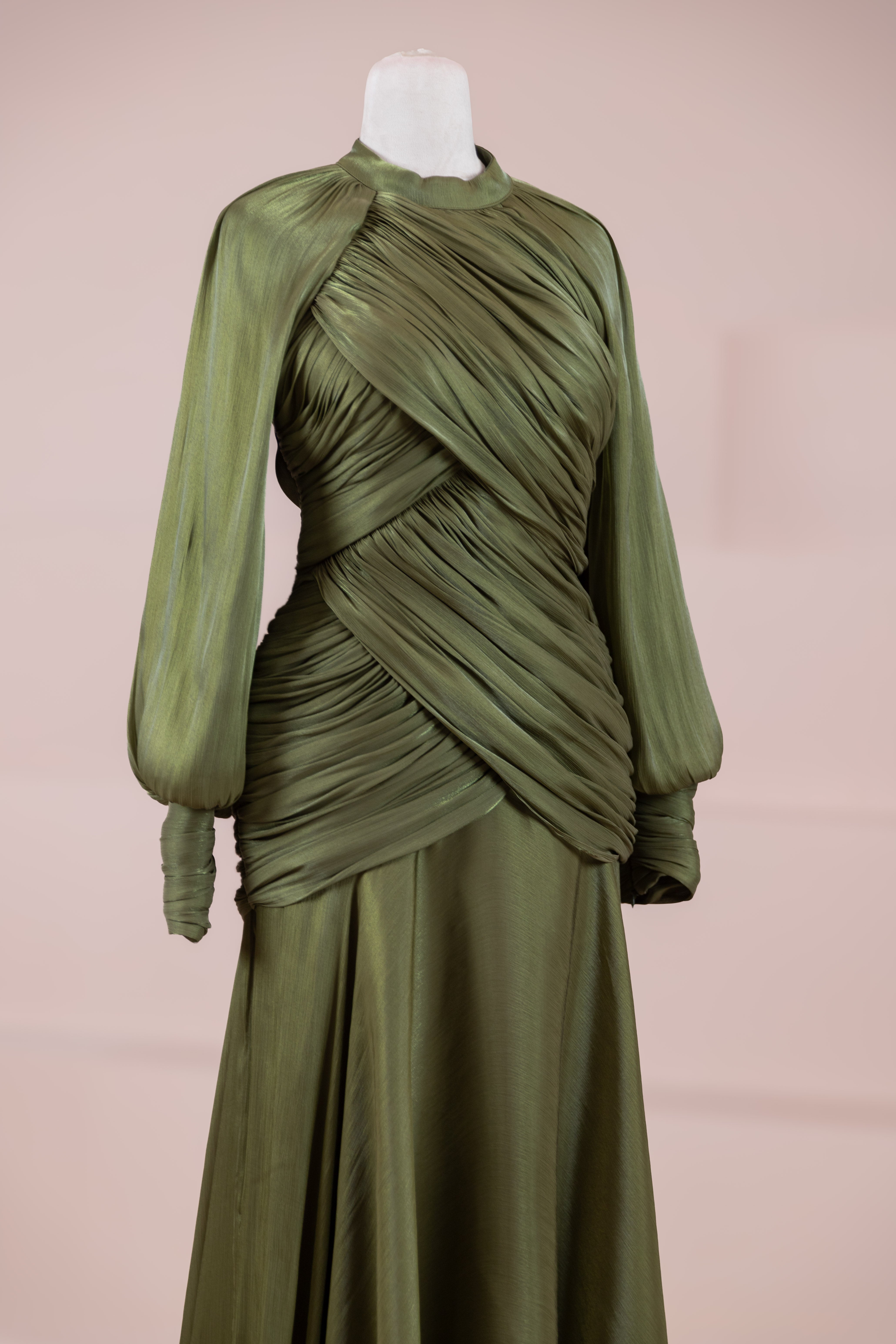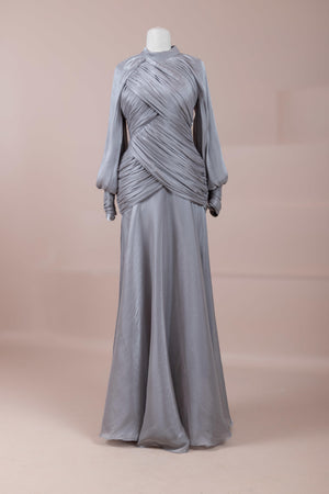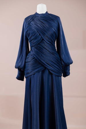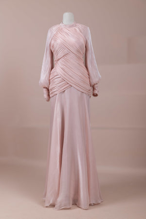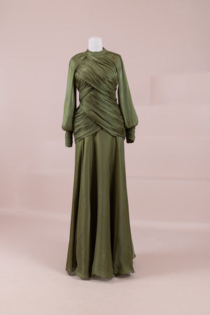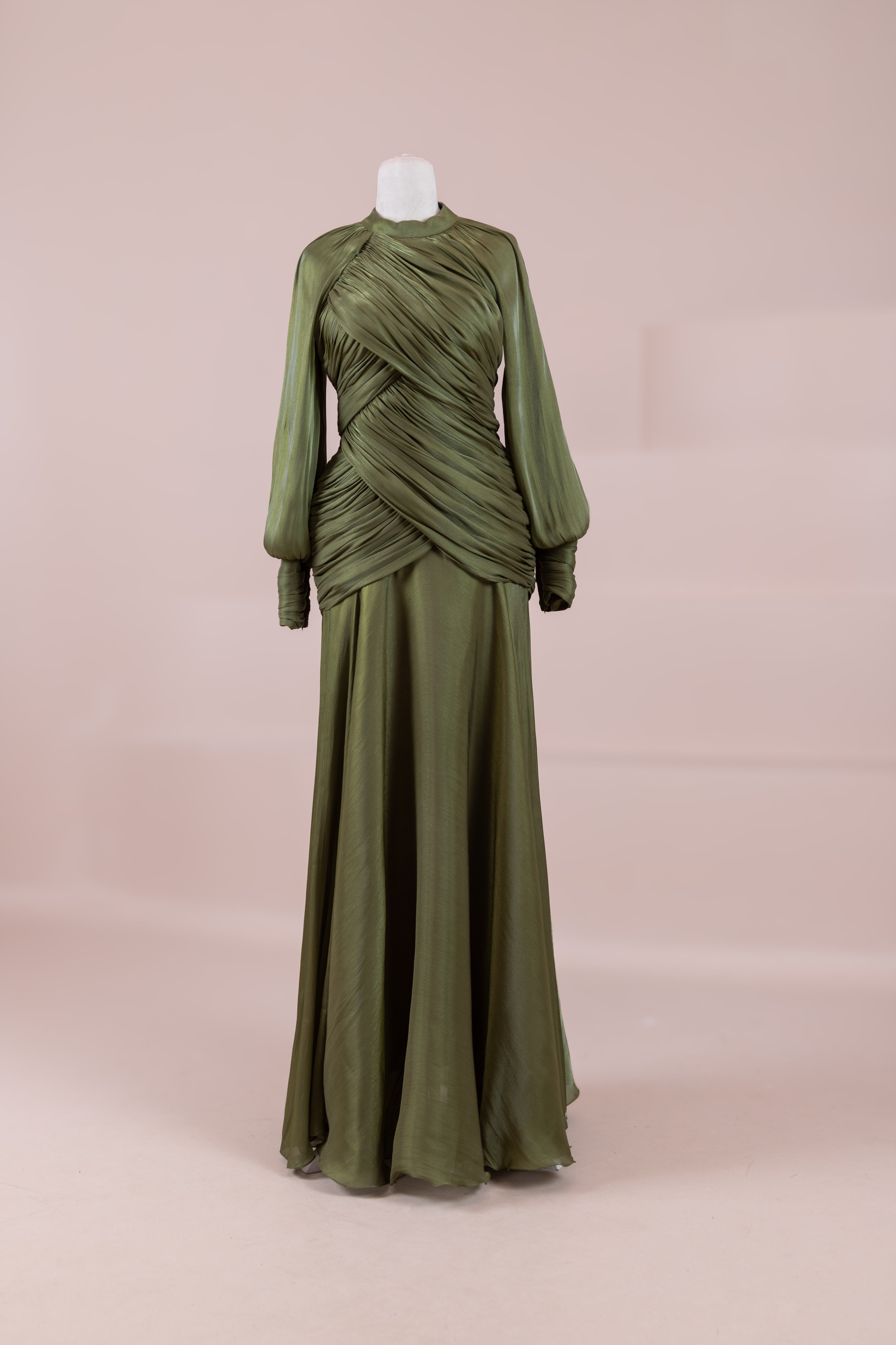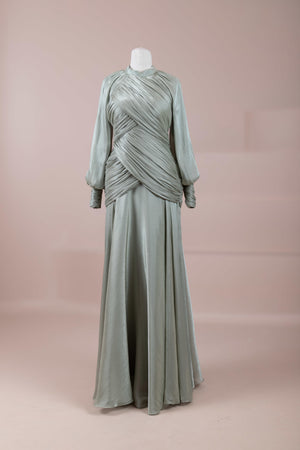 يتميز هذا التصميم بخطوط أنيقة وانسيابية، مع الجزء العلوي الملتف حول الجسم وتنورة متدفقة تقدم مظهرًا أنثويًا. ياقة عالية وأكمام طويلة تضفي مظهرًا راقيًا، بينما تضفي تفاصيل الدربيه المتقاطعة شكلًا على الخصر وتوازن خطوط الجسم بأناقة. تصميم الأكمام التي تجمع عند المعصم يضيف حجمًا ناعمًا للتصميم. تنورة طويلة ومتدفقة توفر حرية الحركة والراحة.