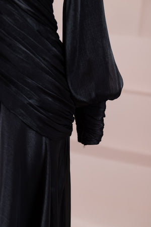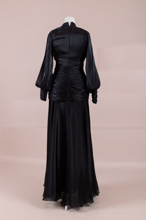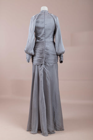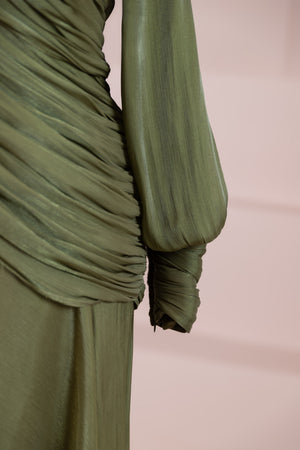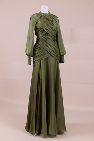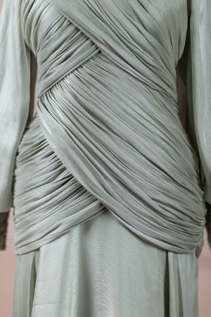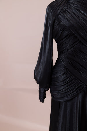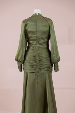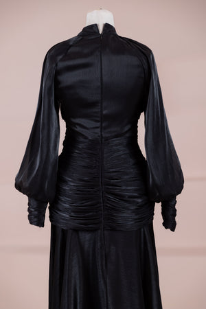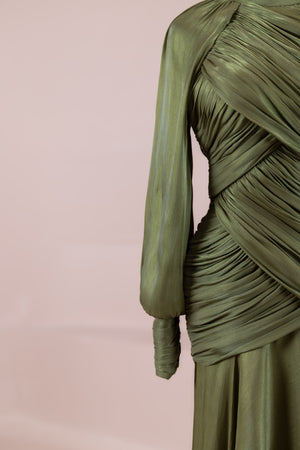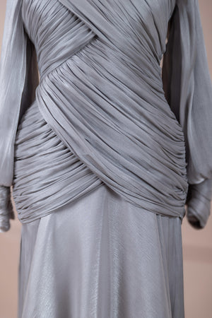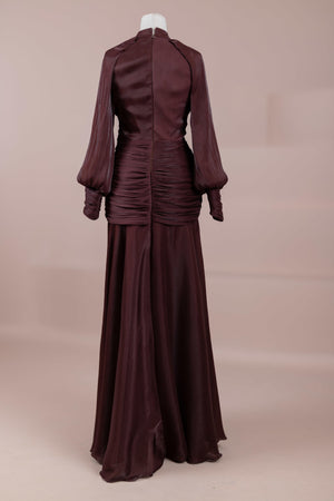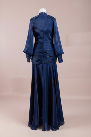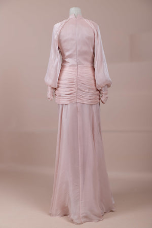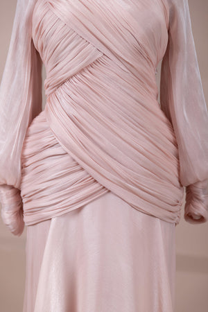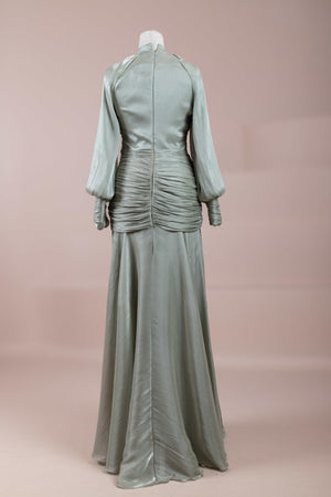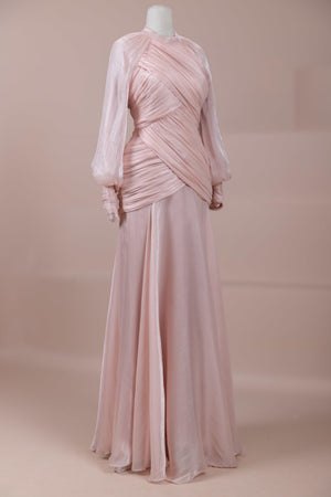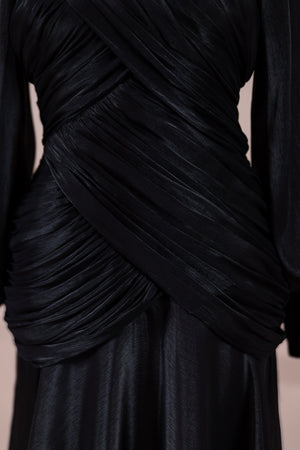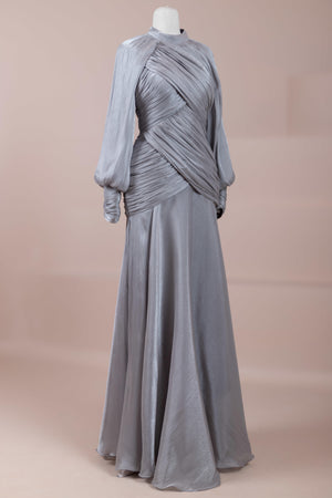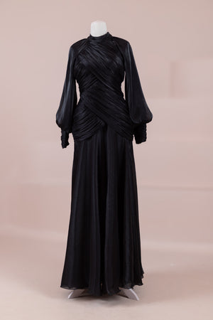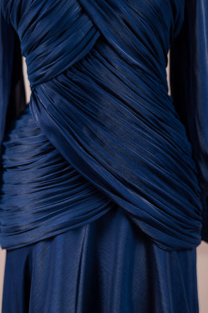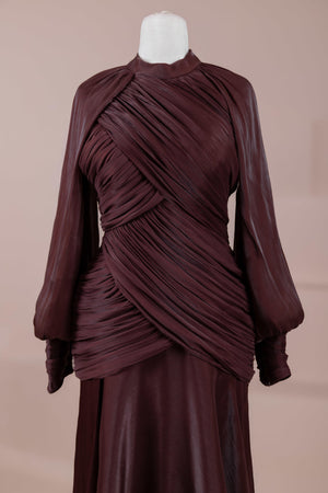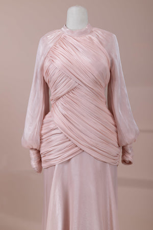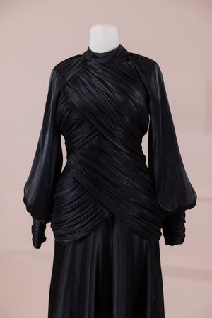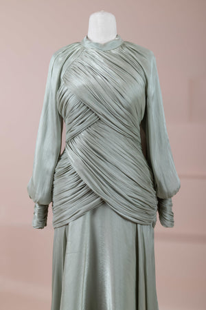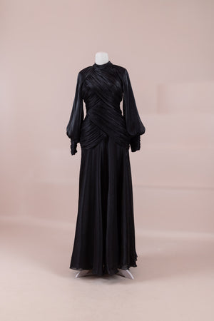 يتميز هذا التصميم بخطوط أنيقة وانسيابية، مع الجزء العلوي الملتف حول الجسم وتنورة متدفقة تقدم مظهرًا أنثويًا. ياقة عالية وأكمام طويلة تضفي مظهرًا راقيًا، بينما تضفي تفاصيل الدربيه المتقاطعة شكلًا على الخصر وتوازن خطوط الجسم بأناقة. تصميم الأكمام التي تجمع عند المعصم يضيف حجمًا ناعمًا للتصميم. تنورة طويلة ومتدفقة توفر حرية الحركة والراحة.